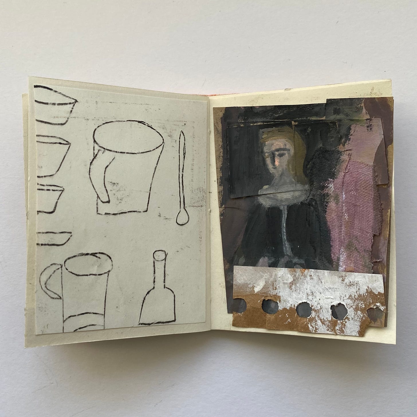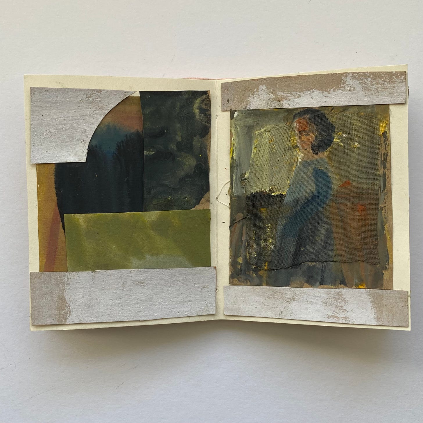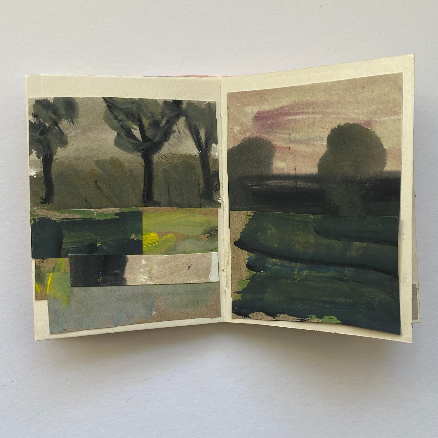 The small book I showed a glimpse of last week - here are more pages for you to see. I am already putting together bits and bobs in a box ready to make another book. It is my intention to make several small books over the spring and summer months. These will be sketchbooks, of a sort. Nothing is precious, everything is available to be cut up and reinvented. Making these small books allows me the space to work in a more abstracted way, perhaps, but also I simply enjoy cutting, sticking and finding possibilities.