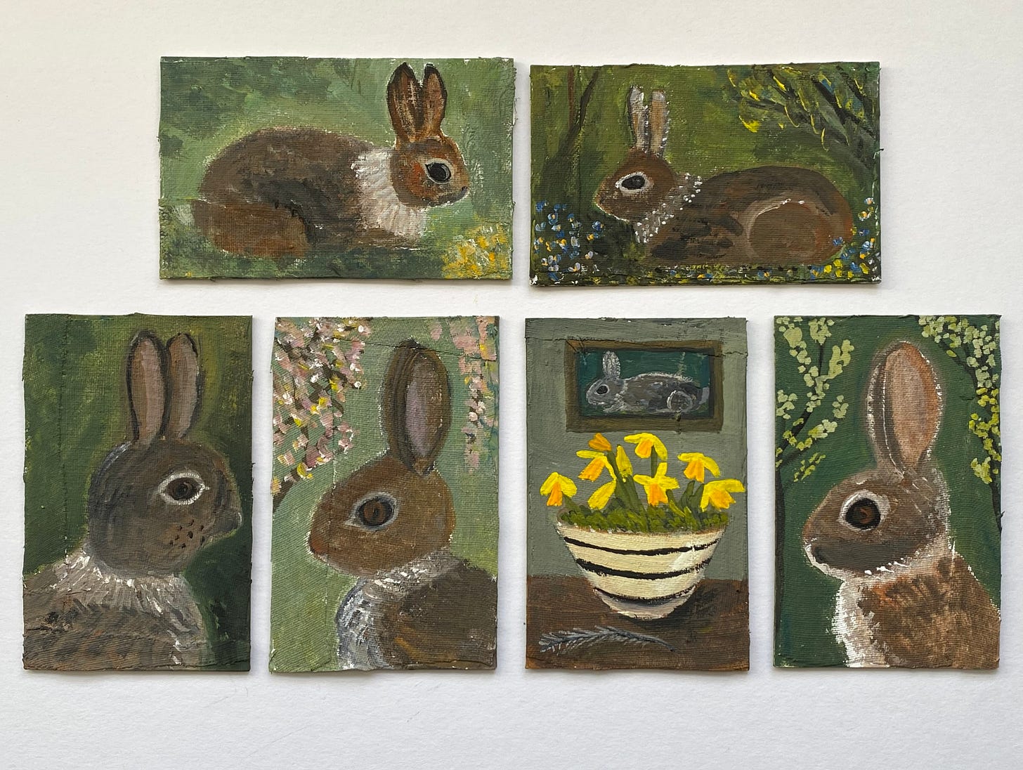 photo: a group of tiny rabbit paintings