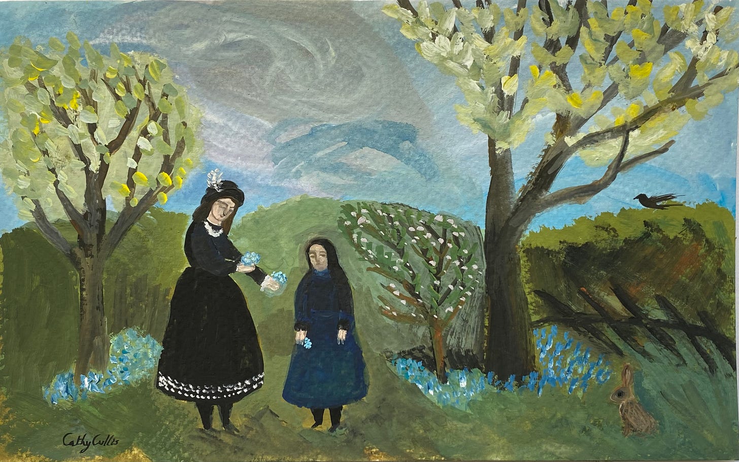 Now it is spring, I have spent the past week painting - people and rabbits, and flowers, and trees. As I find a new figure in a landscape, so I know she will have a dark skirt to contrast with the light-filled greening of the world she stands within. I have enjoyed discovering stories in paint this week. I have painted tiny figures and not quite so tiny figures.