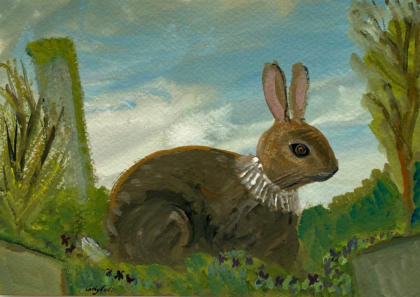 I love painting...of a rabbit painting! Cathy, your talent is boundless. I liked hearing how your painting preferences in clothing have dribbled over into your real life, and of course, I love your short fictions. Just wonderful.
