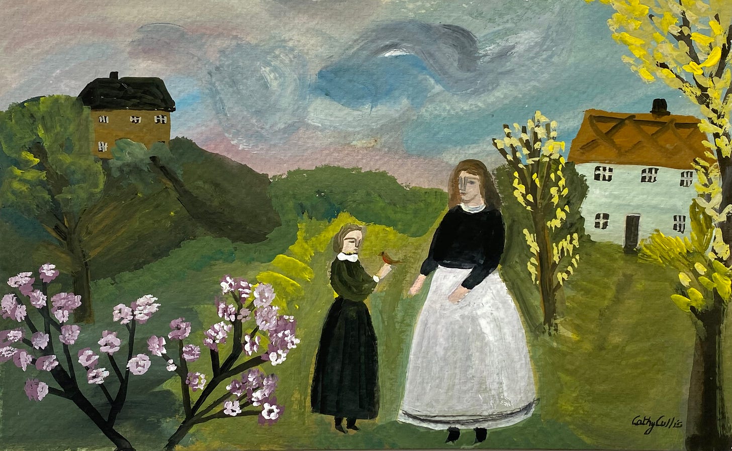 I hope you are well. We are now in the spring zone - sun is forecast for the next several days and people are dressing in an ever-more confused fashion. Take a walk in my neighbourhood and see the flip flops mingling with padded jackets. I love to see how people dress to express themselves - there is no wrong way of doing this. When I draw and paint figures, I tend toward a strict dress code of my own imagination. You may have noticed I tend to dress ‘my people’ in simple, timeless clothing that might belong to the past - but a past that is quietly eclectic and not fixed. There are elements of Victorian and Edwardian fashion in my artwork, because this is what I instinctively draw upon. I always have. I collect antique photographs and have these on display, rotating faces and dresses. I like black and white clothing. For myself, I love to wear black with just a little colour. Over time the people in my paintings have quietly whispered their influence into my own wardrobe.