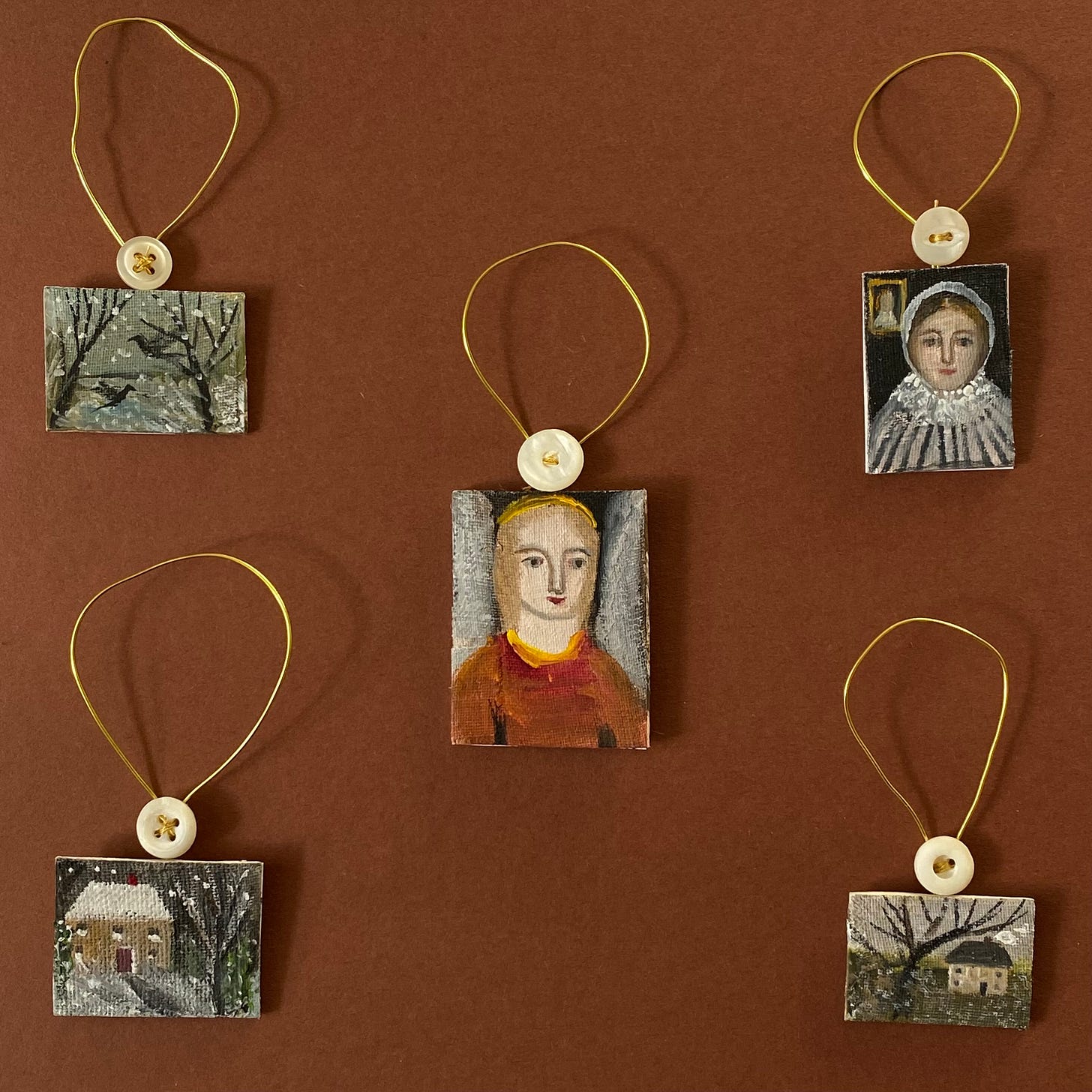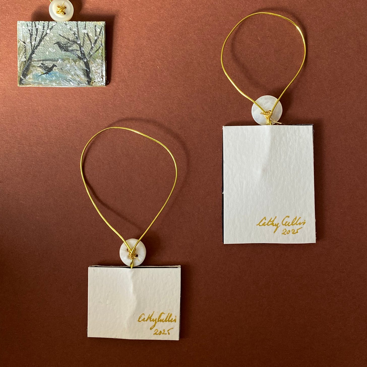 Meanwhile, I have been busy painting on a very small scale indeed…. I am making an ongoing collection of miniature paintings that are designed as hanging ornaments. Yes, with winter decorating in mind, but also as year-round display pieces.