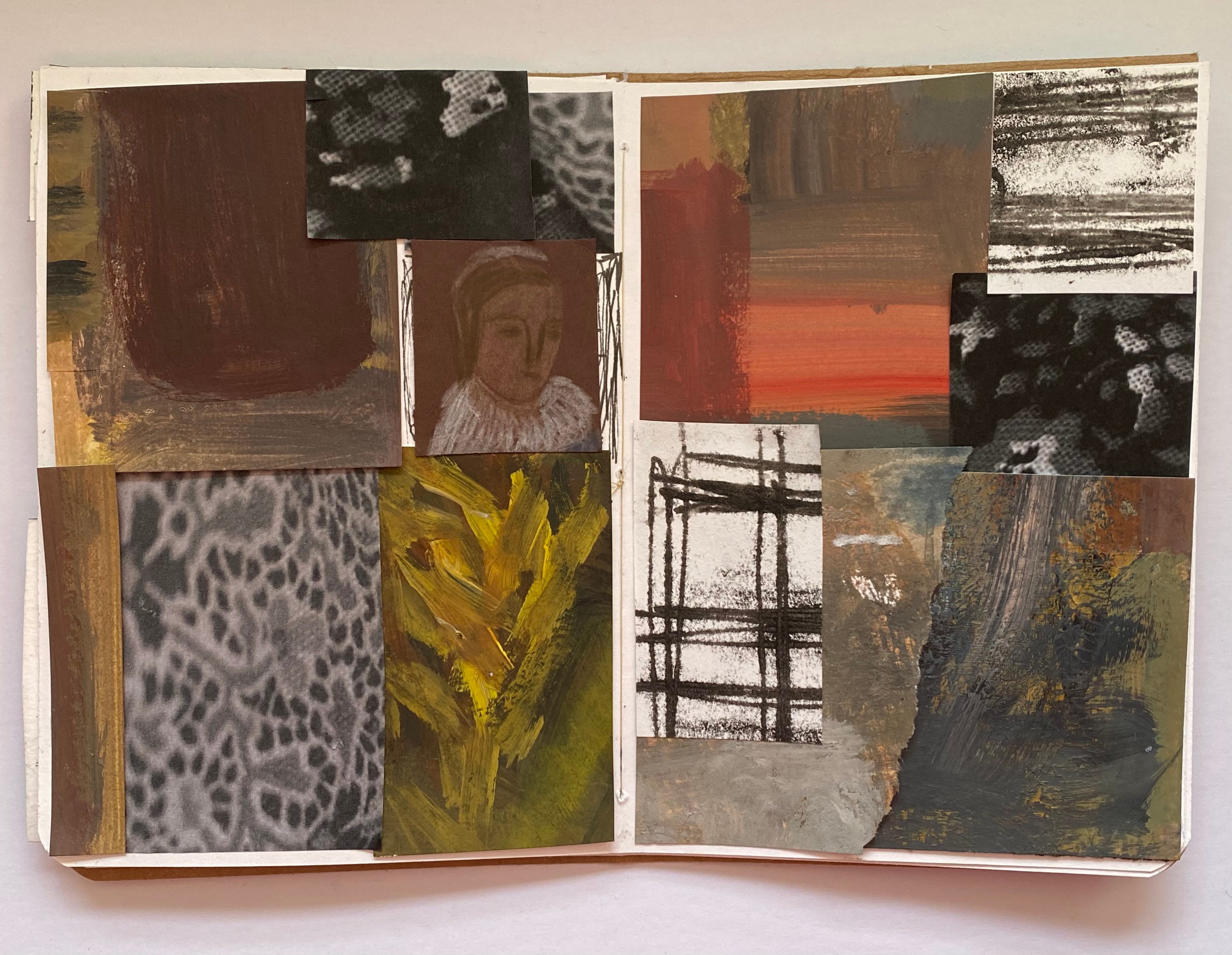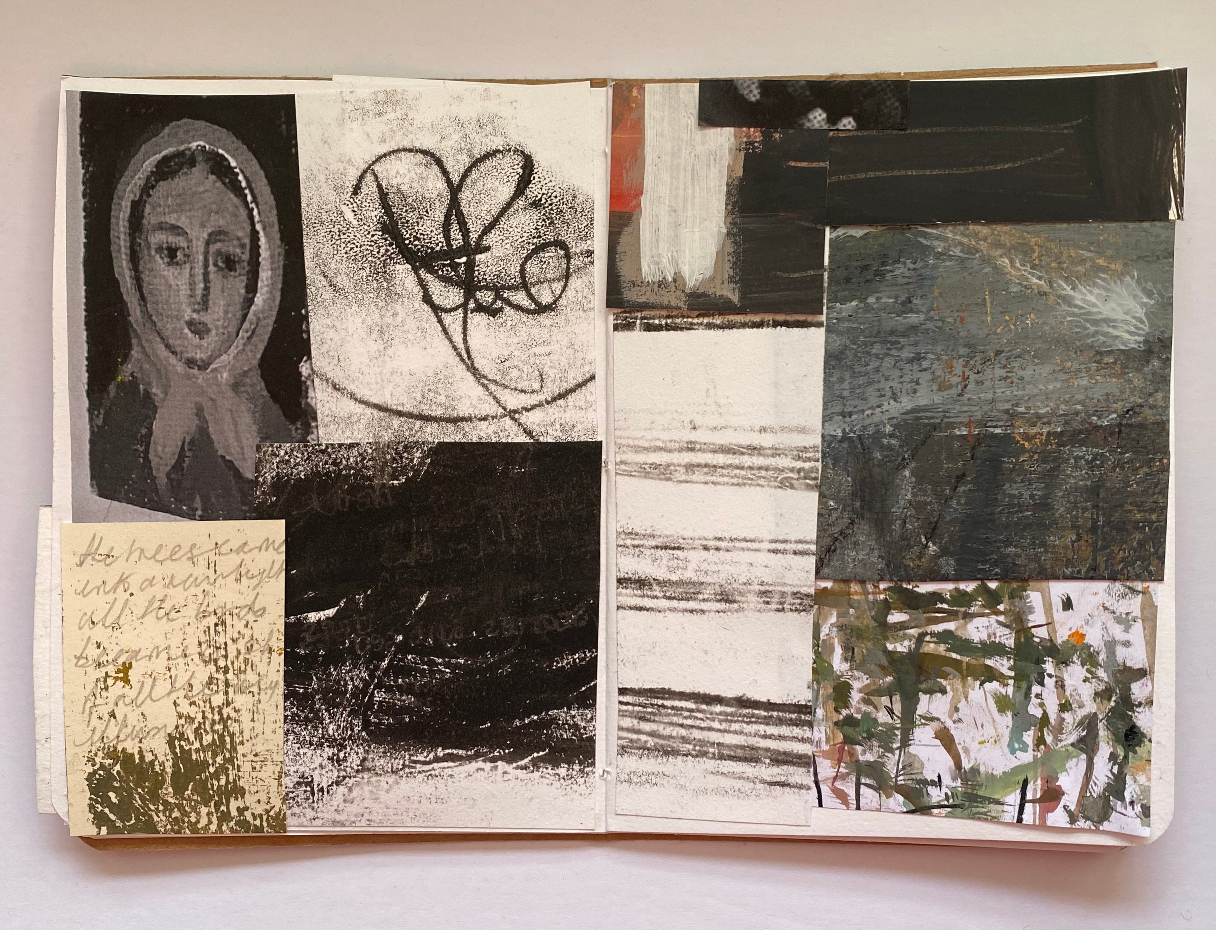photos: sketchbook pages in my collage book. Enjoying the playfulness of cutting and mixing pattern, texture and limited colours. The face/portrait in the top left page has had an interesting journey to get there - she is actually a tiny painting in my own collection. I took a photo of her within a miniature scene. I then altered the photo to black and white. This was printed at a much bigger than life size - I then cut up the image and used it in my sketchbook….