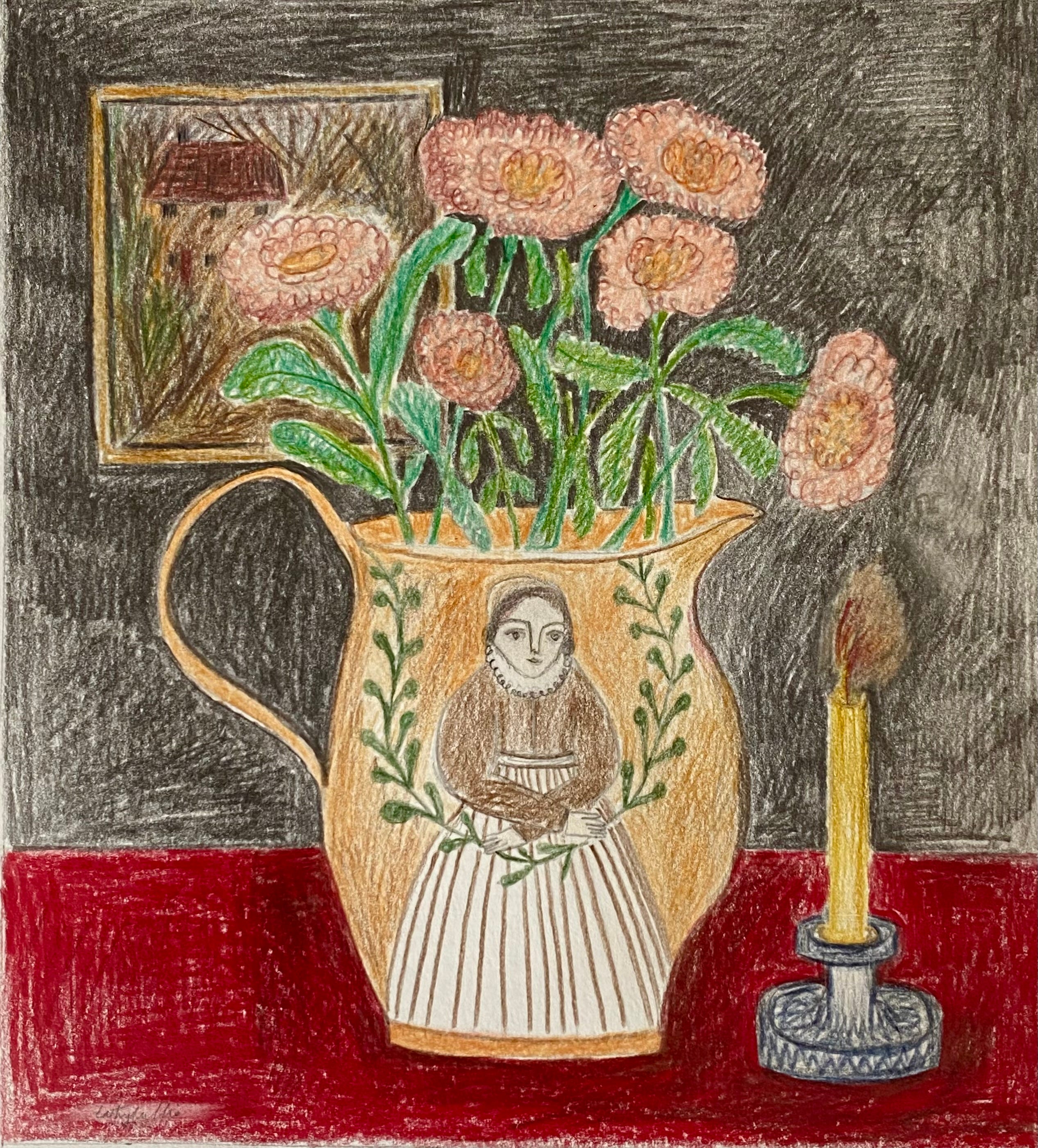 photo: a recent daily drawing - a smaller one. You may see how I am allowing myself to go with the flow of ideas - candlesticks are appearing in many of these drawings. I suppose I have a slight yearning for candlelight - but would never light a candle in this listed building! Must seek out an electric candle soon. For now I have candlesticks for drawing reference but use a rolled up piece of paper for the candle.