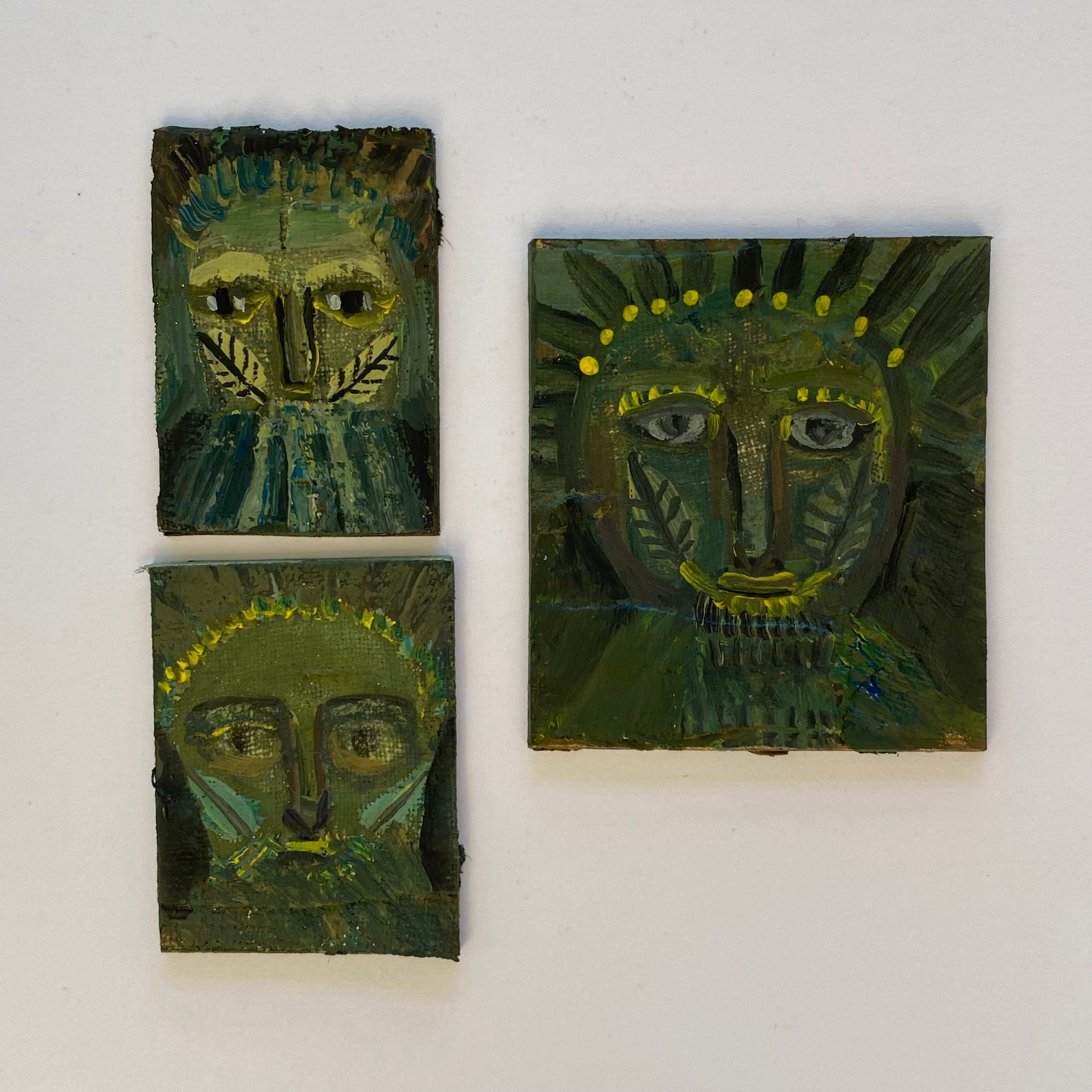 photo: three green man portraits - each time I paint a green man he wants to be his own spirit in leafy green! Some thoughtful, others a little trickster-looking…. I will be continuing on with these, as inspiration comes to me