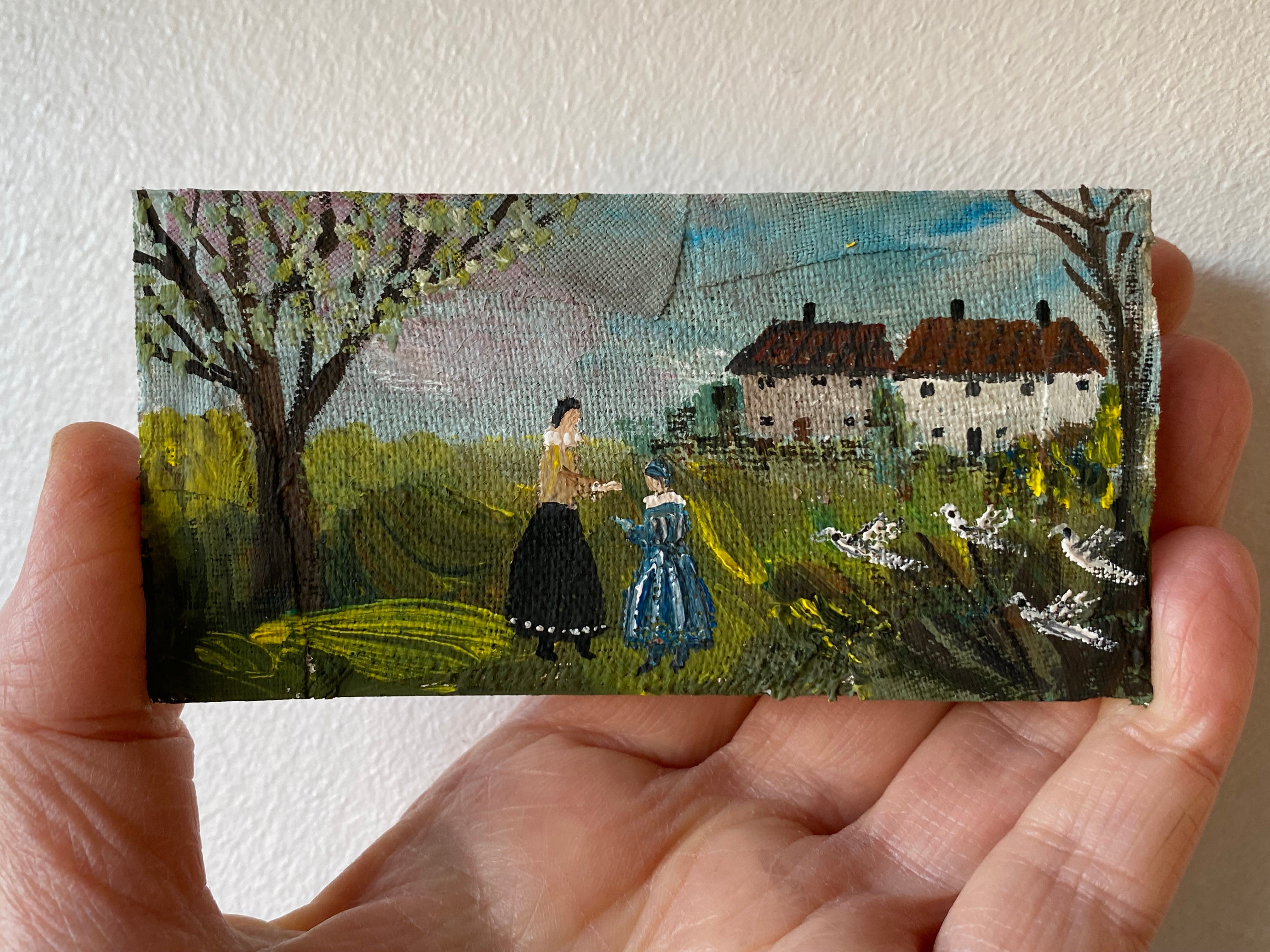 Here’s a smaller painting - not super-tiny but still quiet small. Note how I am thinking about the proportions of landscapes. I used to keep to a set size when painting these works on linen/mount board. But now I am experimenting more with all shapes and sizes, with so many possibilities. Here I am working on a wider view of the land.