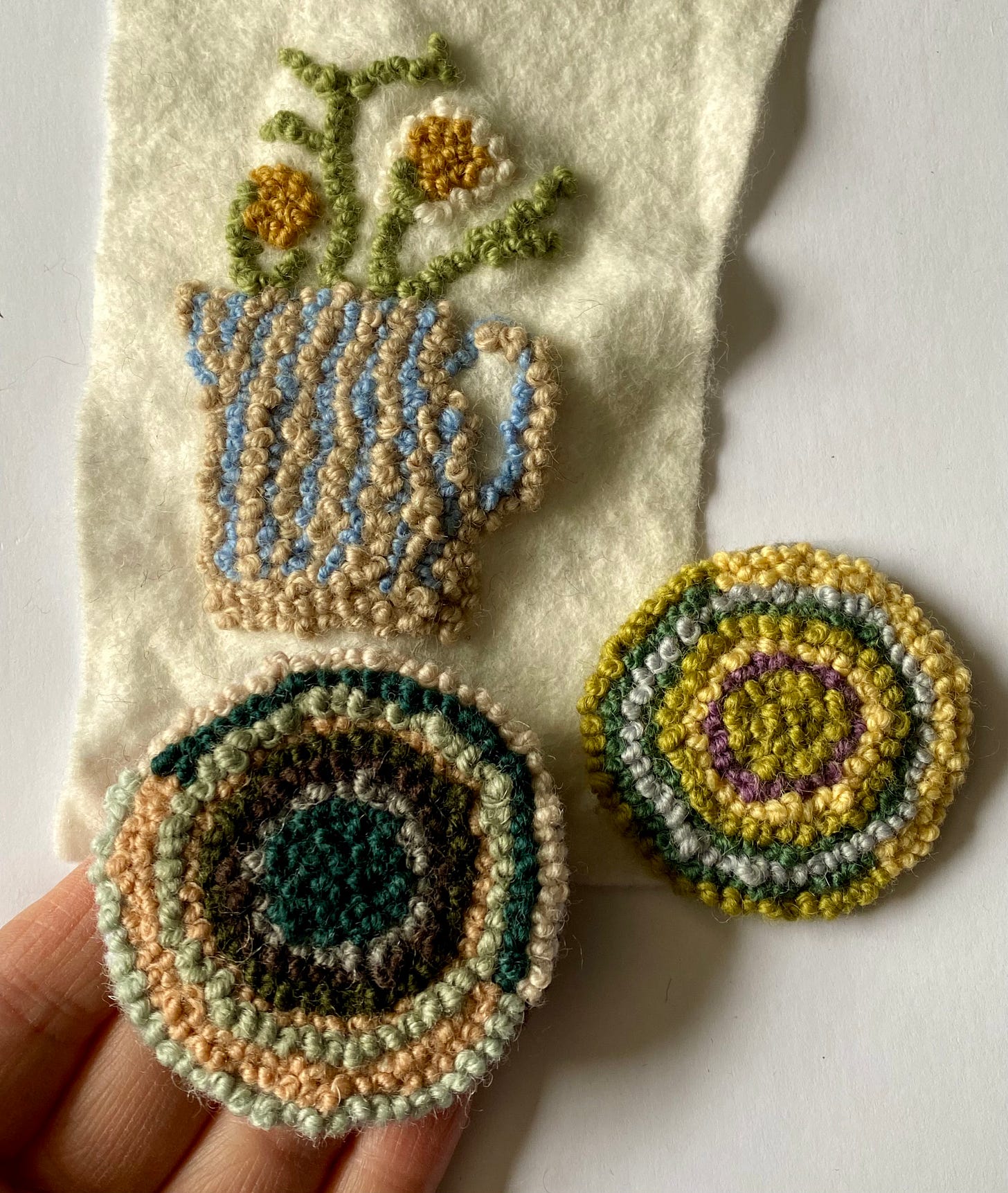 photo: Wool embroidery - shows a few abstract brooches and a larger piece in progress - I am slowly but surely making time to explore my french knot designs…