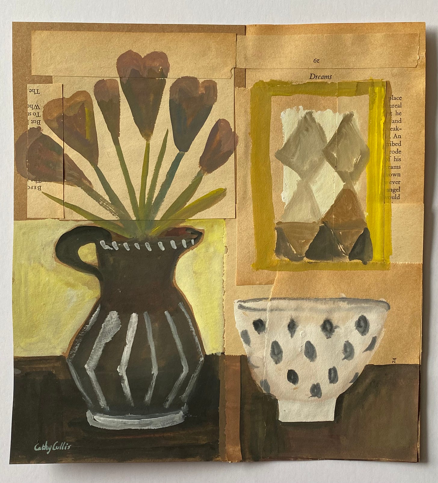 A new work on paper - here I have combined book pages with brown paper to create a collage surface to work upon using gouache paint. I have titled this work ‘Hearts and Diamonds’. It is one of several works I am making/have made recently.