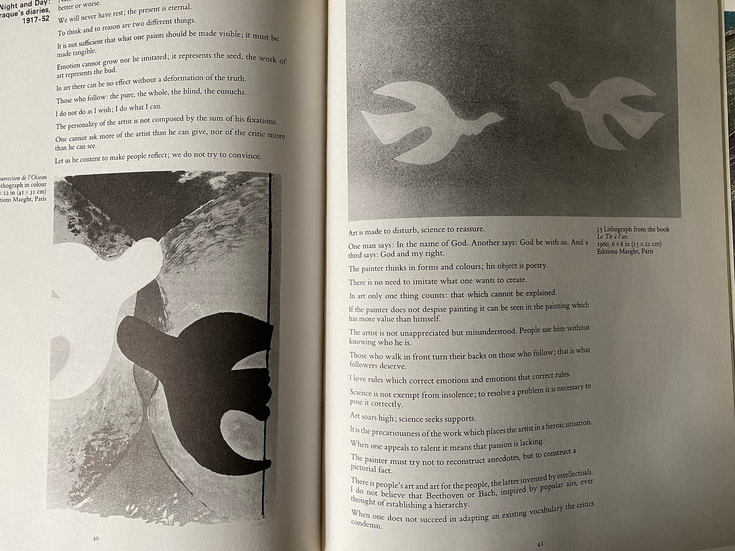 I like Braque’s birds - their shapes and movement. Yes, they make me think of Matisse, another artist I look at. Here are pages from a vintage book I have featuring Braque’s work. There are many black and white photos which are still helpful when looking at examples of his compositions and motifs. I also like reading Braque’s notebooks/diaries.