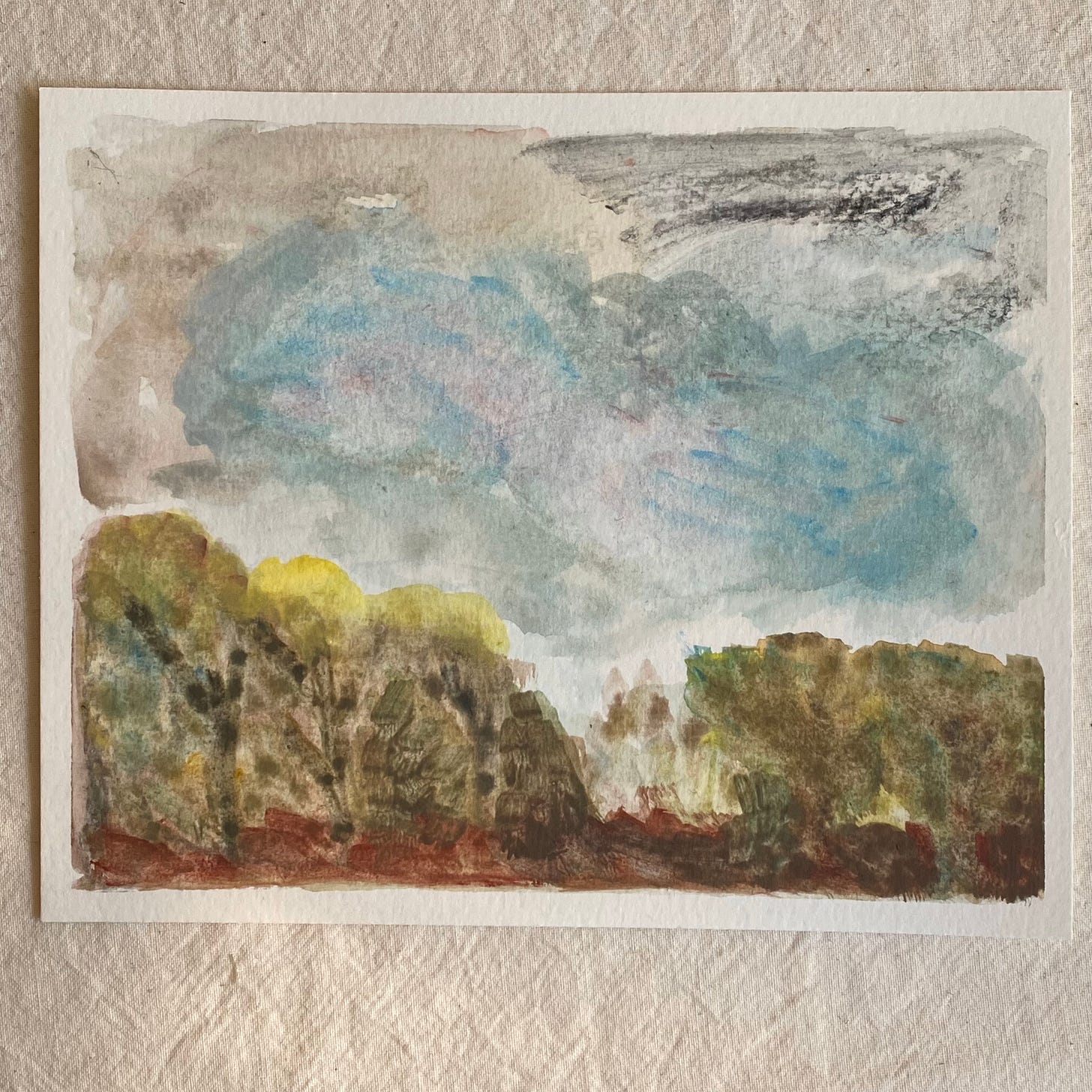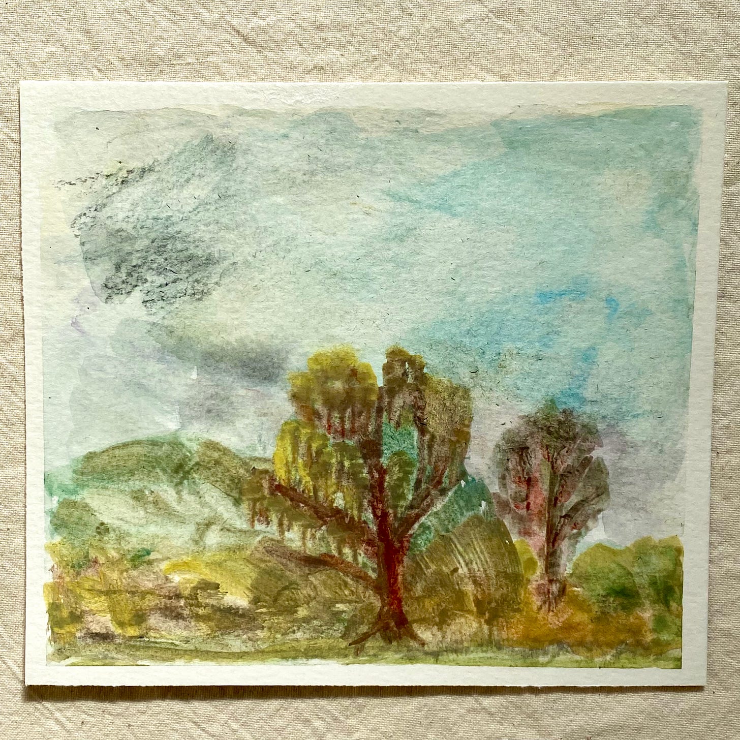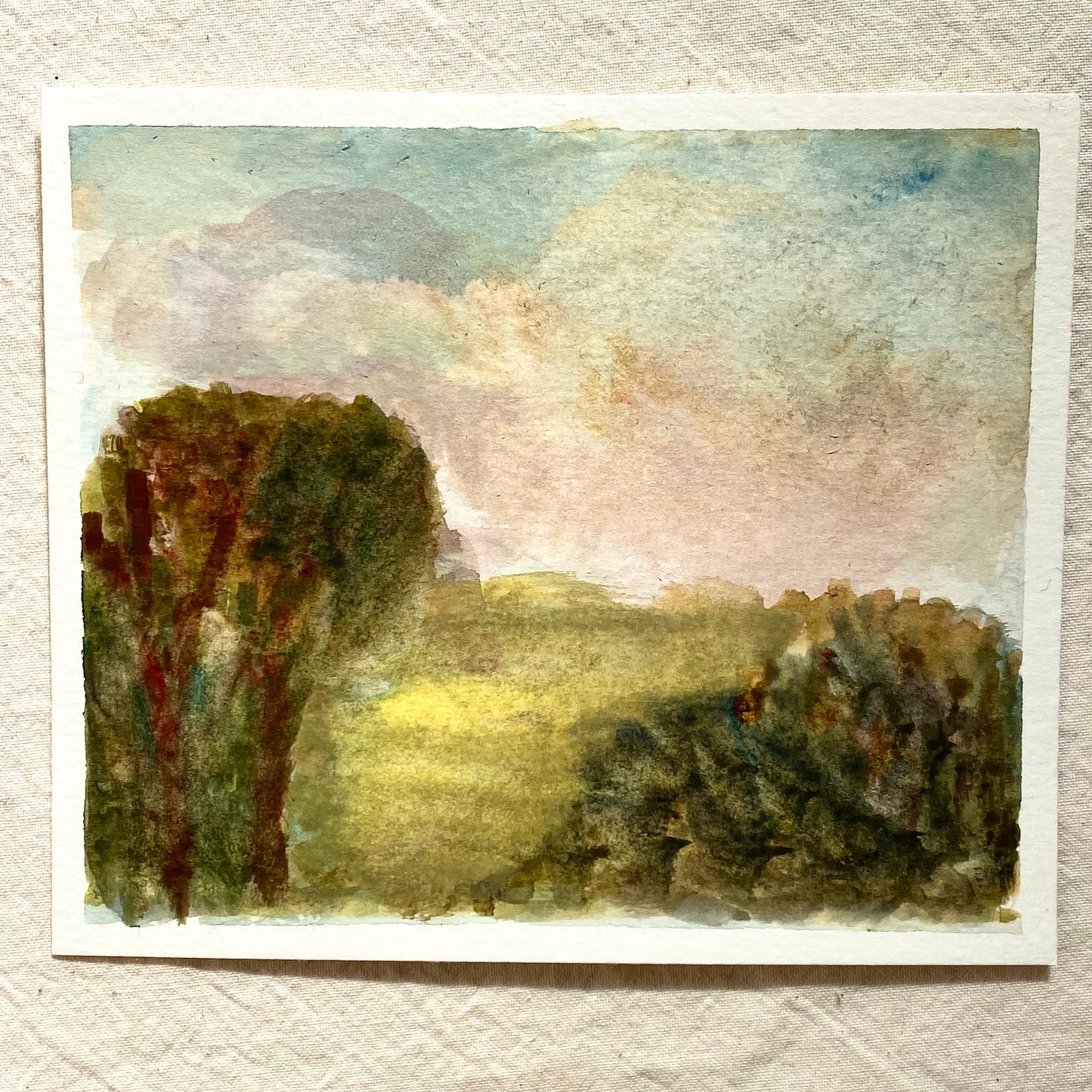 I decided upon painting a few landscape studies, inspired by my local park walks and memories of dream-like places. It was immediately apparent to me that watercolour allows the light into layers. The colours have a consistency that does not dull on drying, unless really muddied up by mixing. I do not use black watercolour but instead I used a little charcoal in places where I wanted a little dark in the sky.
