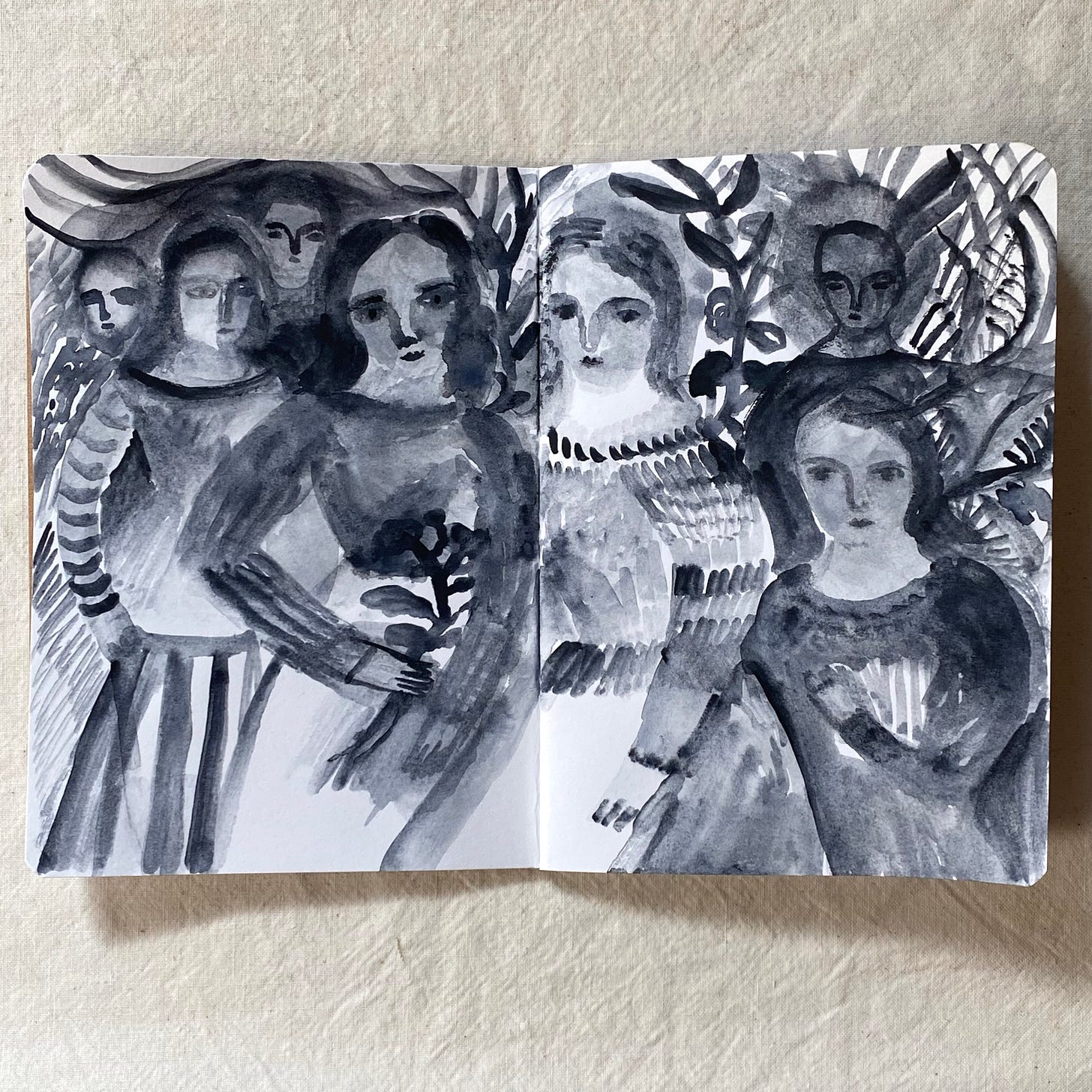 I took a different approach and opened a new sketchbook. With just payne’s grey watercolour, I drew, improvised, finding figures and connecting them as a family within a space. I enjoyed working with the payne’s grey very much - it made a change from my usual jet black gouache - the paint I would usually use for such a sketchbook idea. The gentle, luminious quality of watercolour lends an ethereal quality which is what I am often striving for.