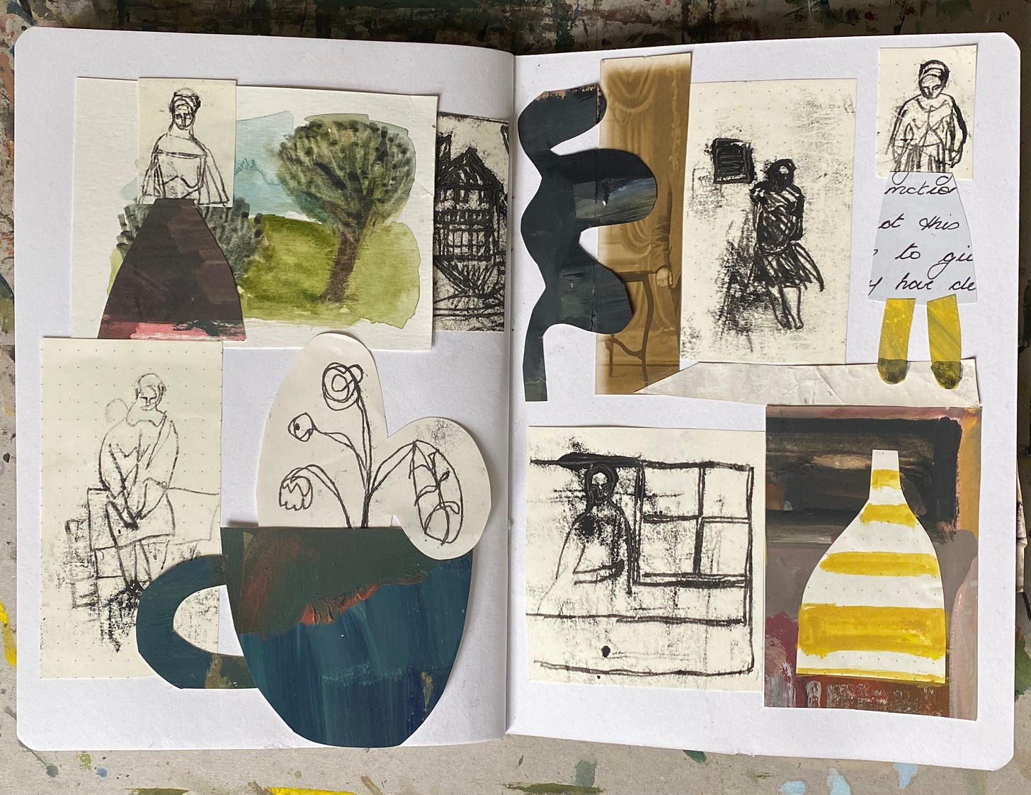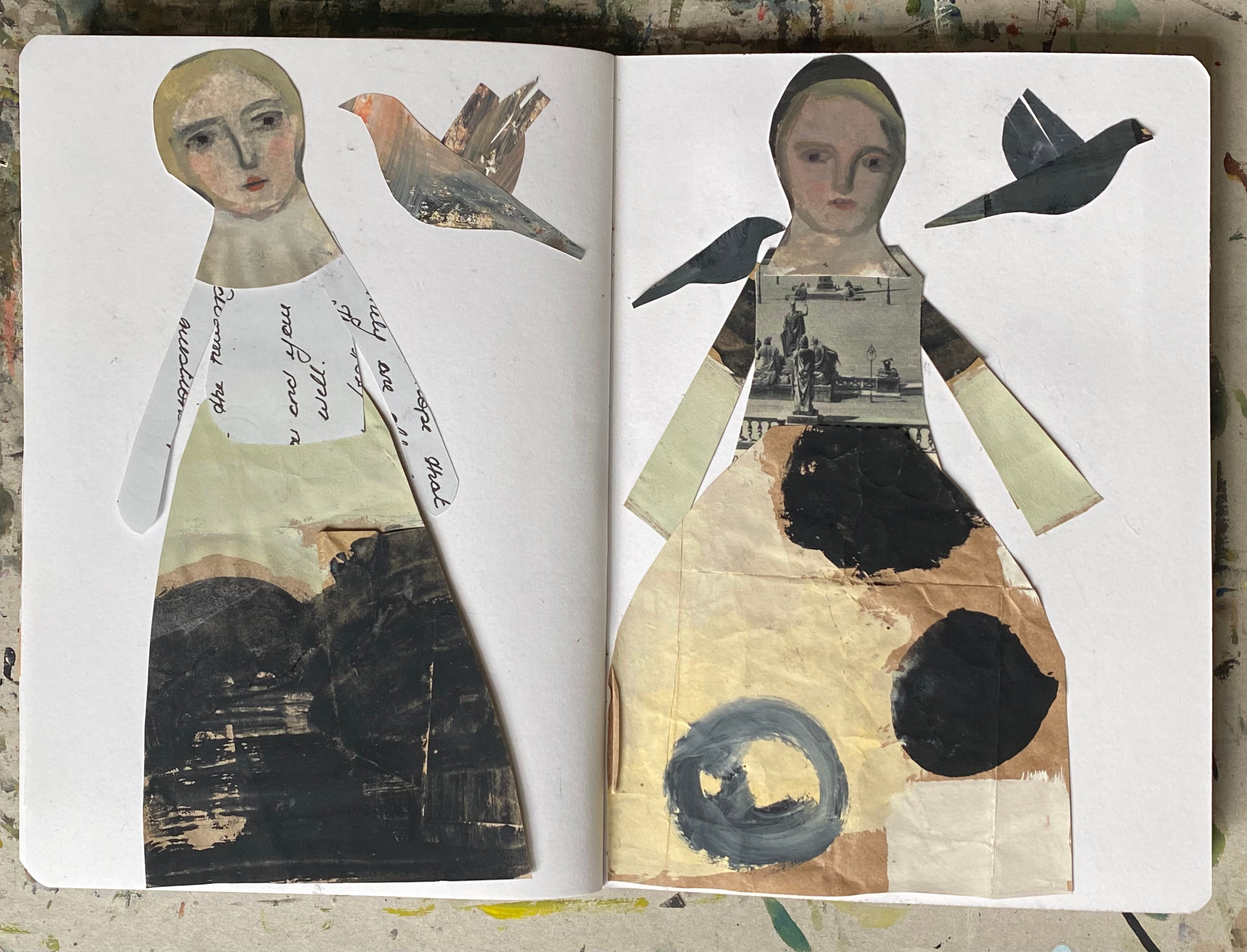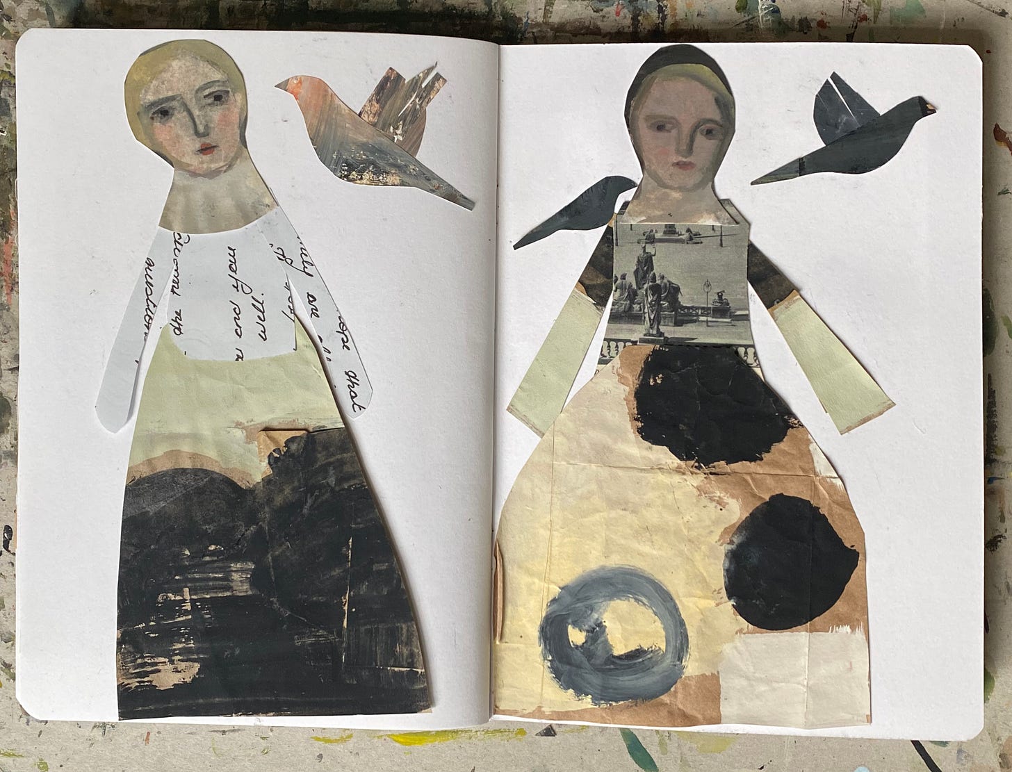 Photo: recent sketchbook pages - I enjoy making collage ‘paper dolls/figures’ very much. I usually start with painting the face and cutting it out. Then I go through my folders of painted papers….