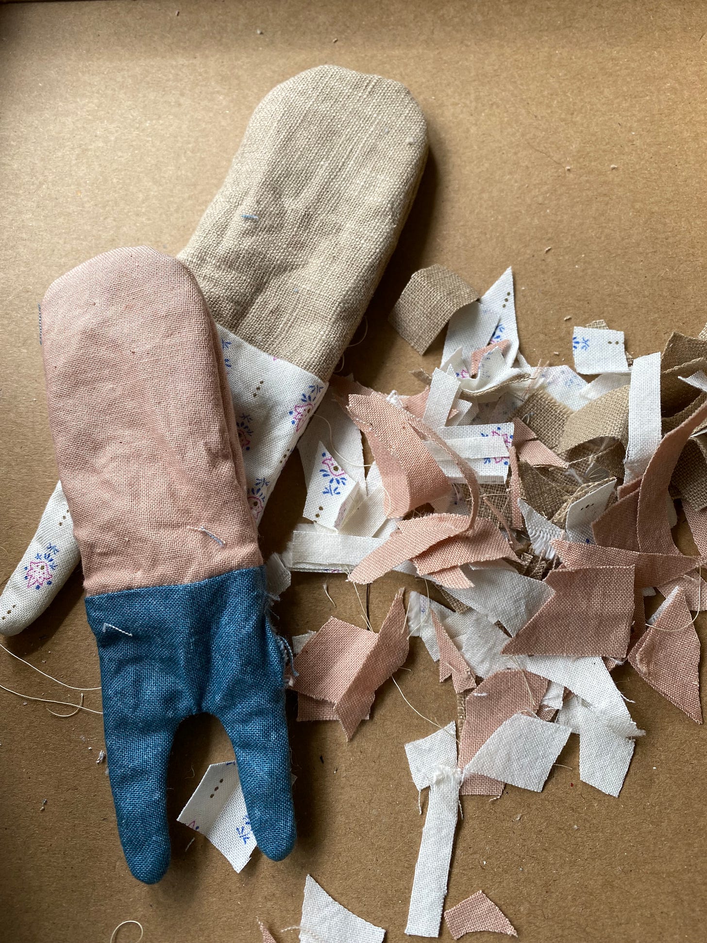 photo: dolls in progress, looking suitably odd and a little creased from being turned, with scraps to fill their legs.