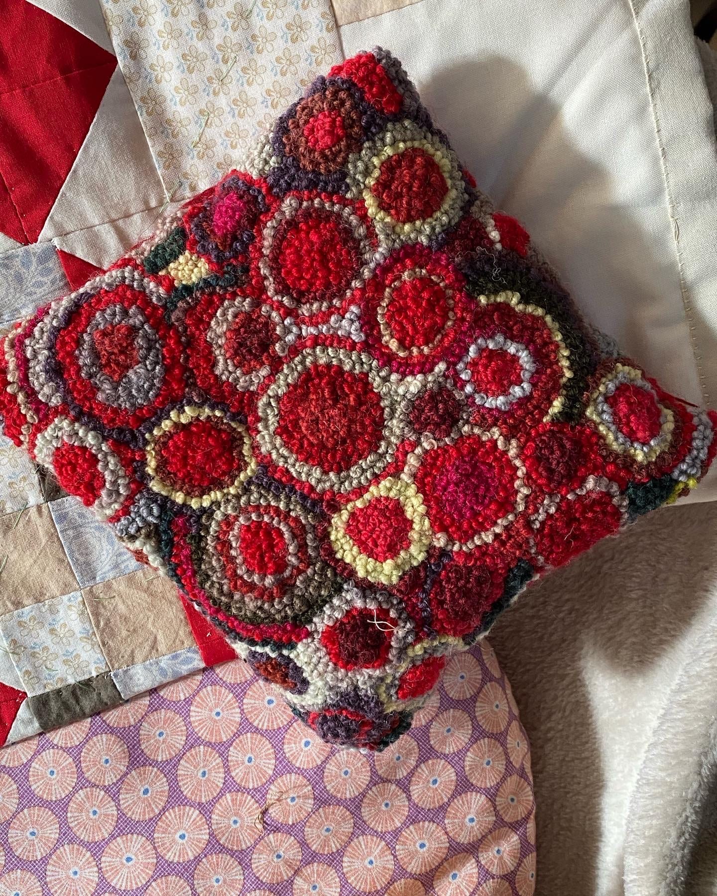 photo: a recently completed personal project - a french knots cushion using up the red I had in my vintage wools stash.
