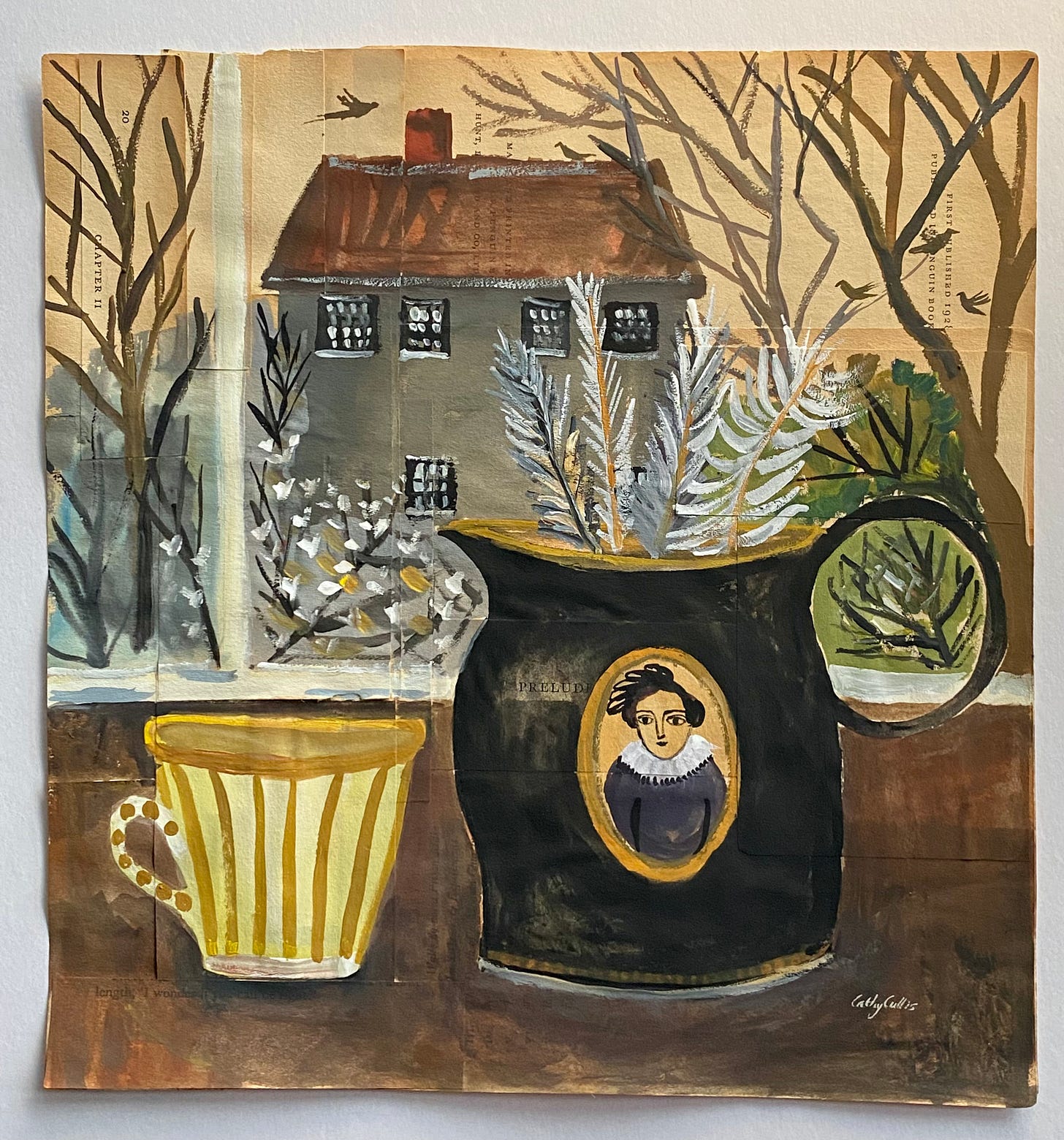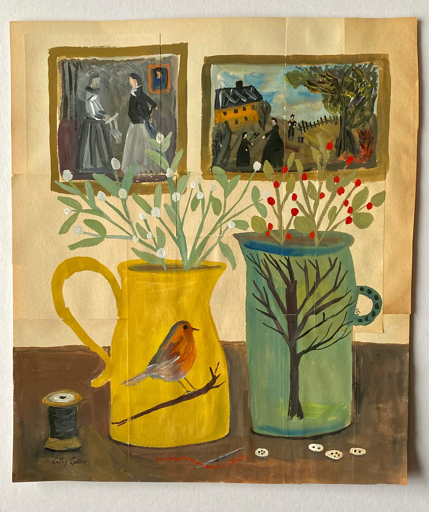 photo: one of three new book page paintings - this one is called Still Life with yellow robin redbreast jug. I often add buttons, thread and other textile objects in my paintings because these are things that are honestly hanging around me all the time, in my working space. Even if I do invent jugs, now and then.